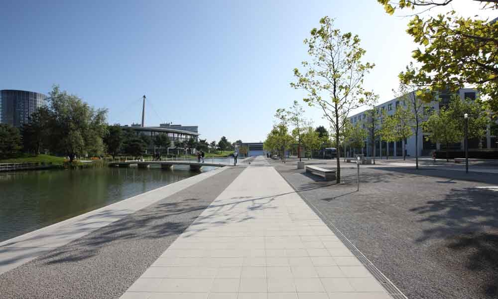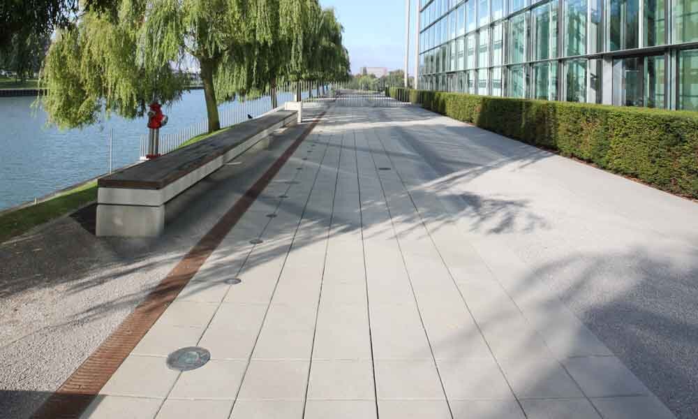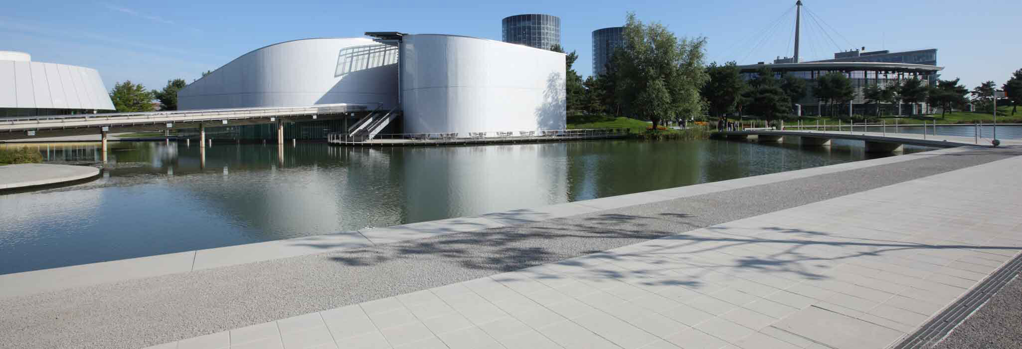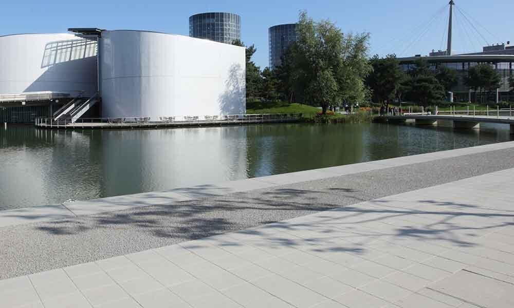 Devant ces bâtiments dédiés à l'automobille , la volonté était de montrer un engagement fort pour l'environnement . Un objectif : Réduire les polluants ! Le pavage sur la place est caractérisé par des propriétés photocatalytiques permettant de réduire les oxydes d'azote dans l'air ambiant. Ce processus est rendu possible par un ciment spécial, inclus dans le béton. Cette technologie peut être appliquée à n'importe quelle surface de béton et utilisée de la même manière que les produits conventionnels.