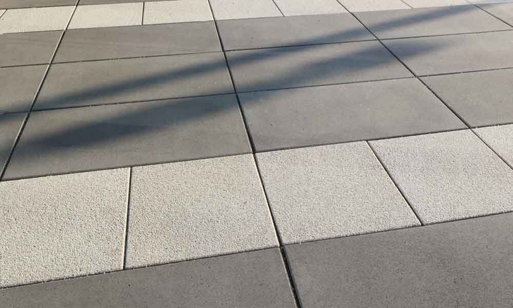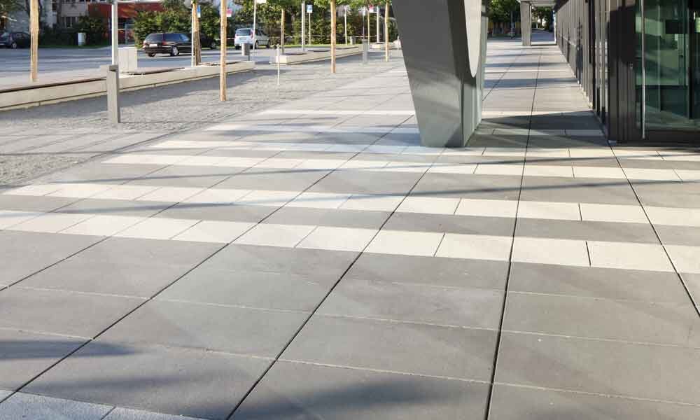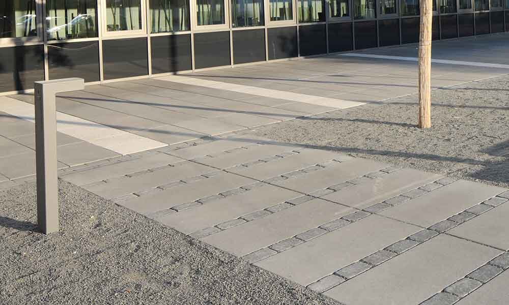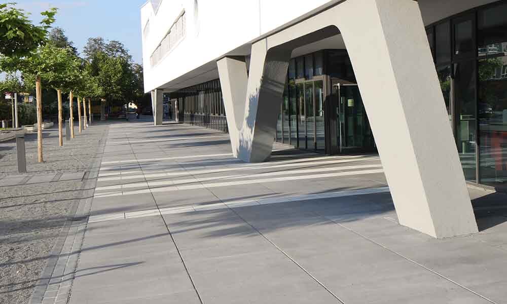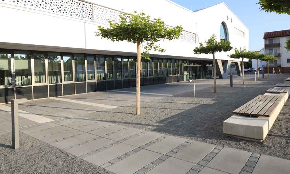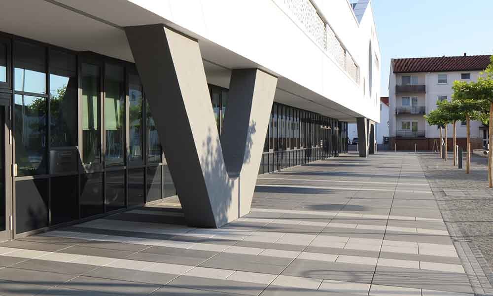Le "Medienschiff", un bâtiment abritant le bureau des citoyens, la bibliothèque municipale et un café, a été construit en même temps que le réaménagement de la place du marché de Weiterstadt. De grandes fenêtres en bande et des piliers en forme de V sont des caractéristiques stylistiques remarquables. Les voies d'accès autour de l'objet sont recouvertes d'éléments de grand format. Un mélange de dalles anthracite de 100 x 50 et de dalles claires contrastantes de 50 x 50 donne ici des accents particuliers.