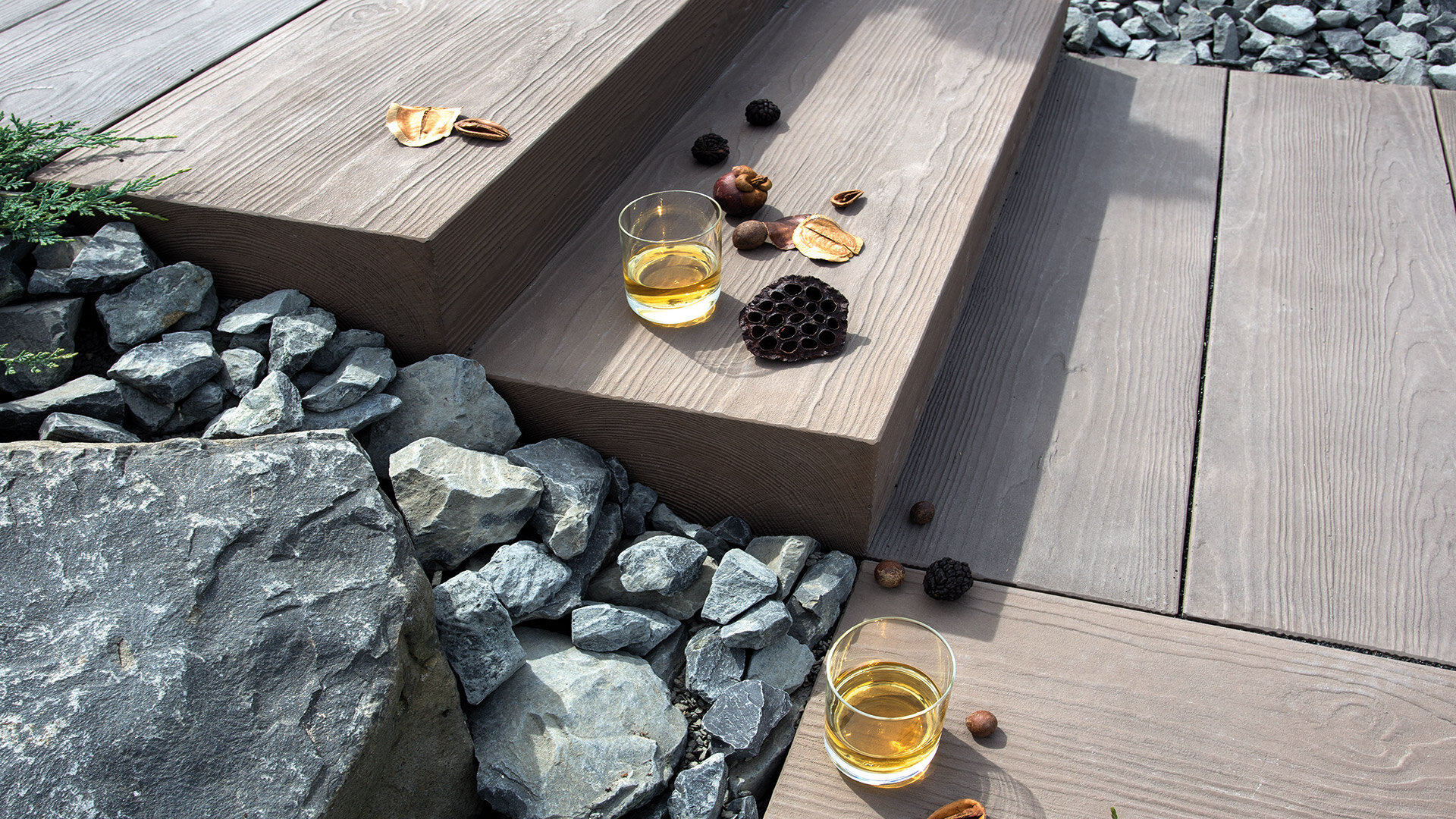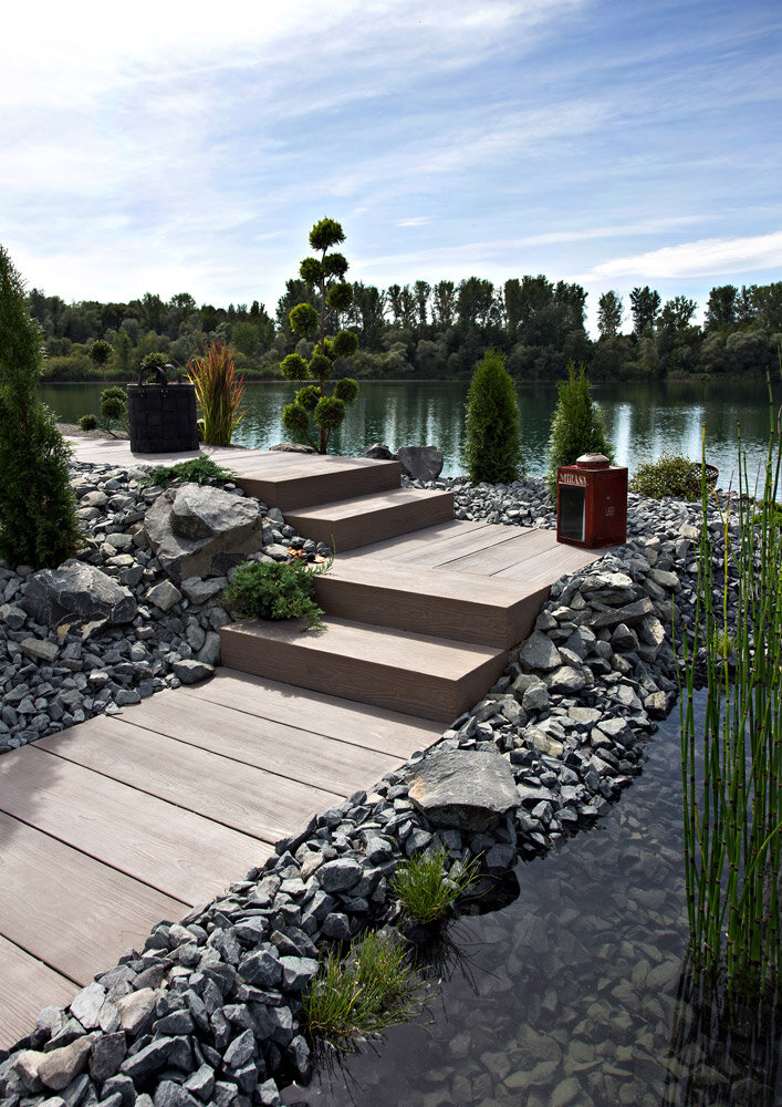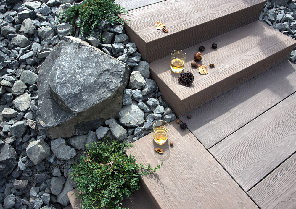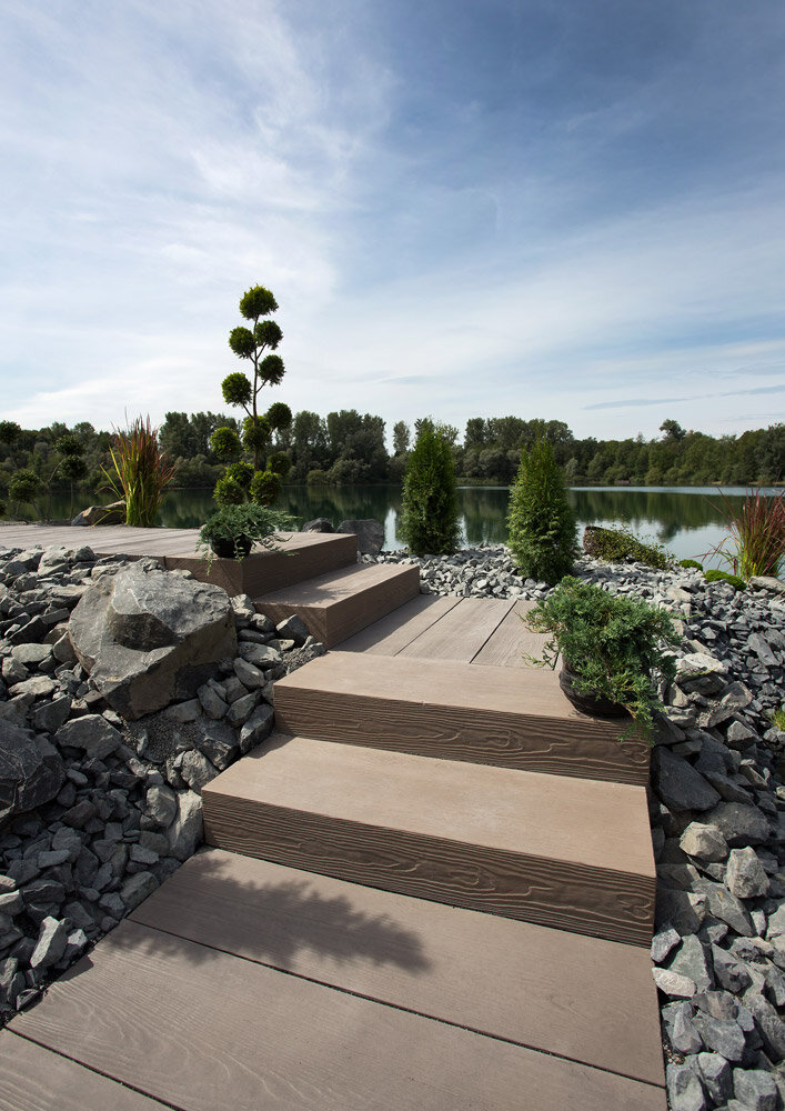 Les blocs-marches Timber créent une transition harmonieuse vers la terrasse tout en conservant le charme unique de ce modèle.