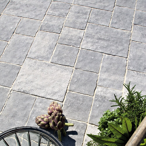 Le mélange de trois tailles différentes donne de la vie à la surface : allée de cour, entrée ou terrasse. L'association décorative se montre particulièrement polyvalente. Des couleurs nuancées choisies et des surfaces en pierre naturelle intemporelles permettent de l'adapter à tous les environnements et styles.
