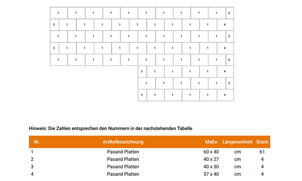 La configuration peut être téléchargée à la dernière étape avec la liste des quantités nécessaires. Un plan précis indique la disposition des panneaux avec leurs dimensions. Cela constitue une aide utile lors de la pose et de la découpe des briques.