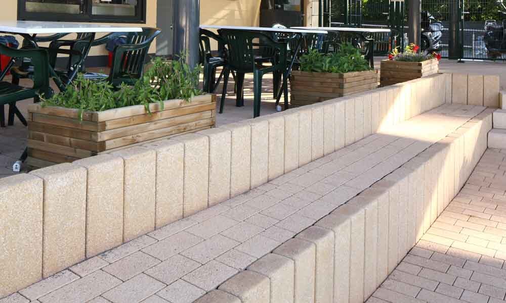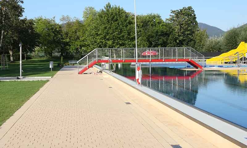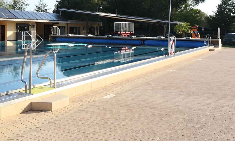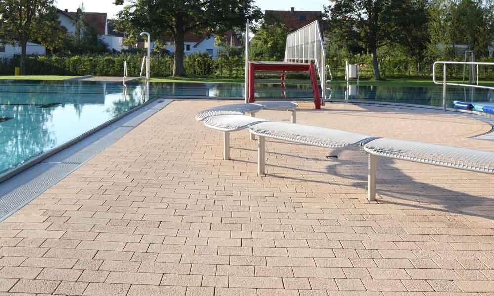 Ici, tout s'accorde vraiment ! Lors de la conception de la piscine extérieure, une attention particulière a été accordée à l'harmonisation des couleurs. Un délicat ton jurassique s'étend dans toutes les zones et crée un sentiment de bien-être inspiré des régions méridionales. Les enfants jouent ici dans un bassin chauffé qui s'étend sur deux niveaux et est relié par un toboggan aquatique. Les nageurs disposent de deux couloirs de 50 mètres et de quatre couloirs de 25 mètres. Des marches spéciales facilitent l'accès aux bassins. Du point de vue de l'aménagement, tout semble d'un seul tenant. Les vestiaires sont recouverts de dalles assorties au système de pavage, les différences de niveau et les parterres surélevés sont réalisés avec des palissades de même couleur. Même les caniveaux de drainage sont fabriqués avec la même formule que le revêtement environnant.