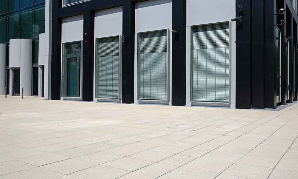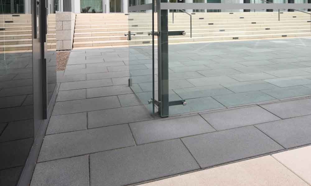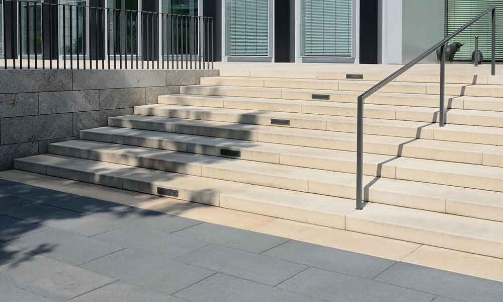 La ligne d'aménagement est poursuivie de manière conséquente dans les installations extérieures. La couleur des revêtements de surface s'oriente vers le mur de soubassement en grès. Les dalles ont été posées en croix et reprennent ainsi la trame de la façade. Le large escalier extérieur, dont la couleur est exactement assortie à celle du revêtement de sol et qui peut être souligné par un éclairage intégré, joue un rôle de guide dans l'aménagement. La zone située devant l'escalier est fixée avec des dalles de grand format de couleur basalte anthracite. Pour la dernière rangée de dalles avant l'escalier, la teinte claire a déjà été choisie pour une transition harmonieuse.