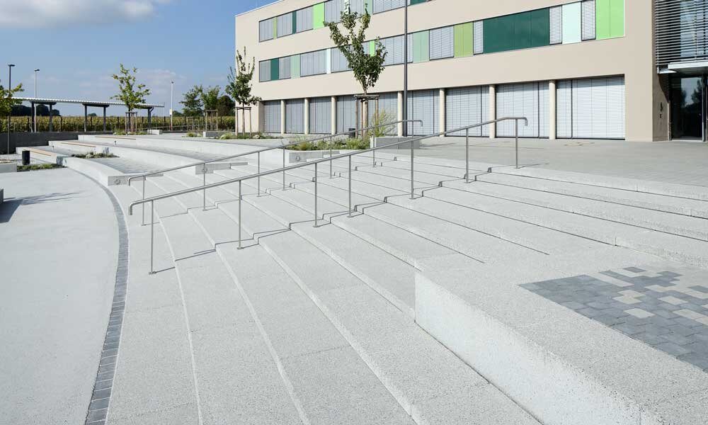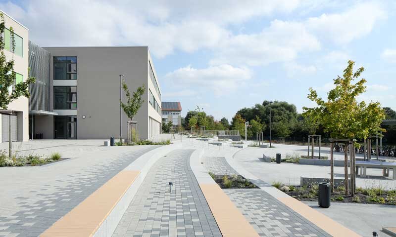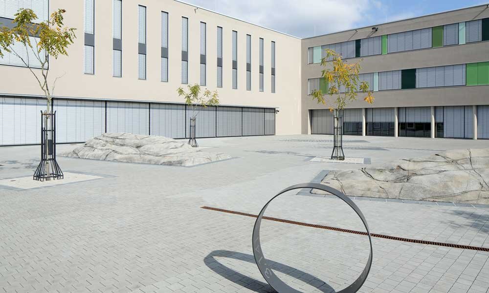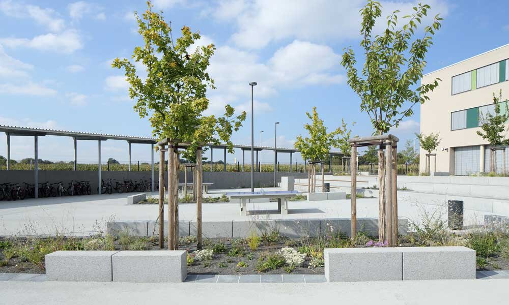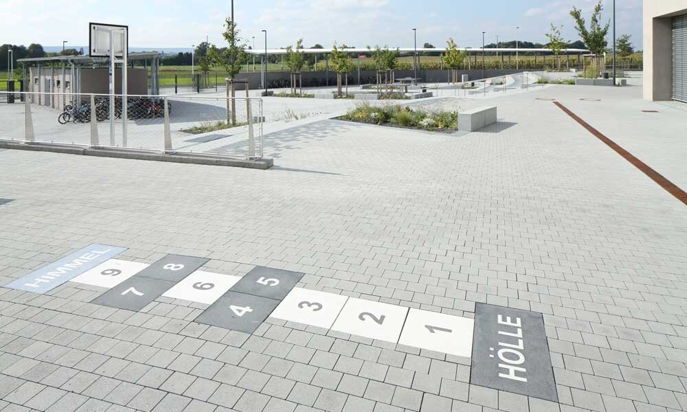 Terrain en plein air au caractère accueillant. L'utilisation de teintes terreuses, allant de claires à saturées, crée une ambiance générale conviviale qui renforce encore le caractère ouvert et lumineux du bâtiment. Les couleurs d'accentuation se retrouvent aussi bien à l'extérieur qu'à l'intérieur du bâtiment et forment ainsi un ensemble harmonieux. De nombreuses possibilités de s'asseoir et de jouer, comme par exemple le jeu gonflable "ciel et enfer", invitent à la détente. Différents blocs de sièges sont équipés d'un éclairage.