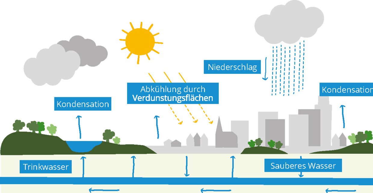 En principe, on distingue les surfaces infiltrables des surfaces non infiltrables. Les sols infiltrables constituent un espace de stockage pour l'eau de pluie et régulent l'ensemble du cycle de l'eau. En tant que filtre et système d'épuration, ils protègent la nappe phréatique et constituent un espace vital pour les plantes et les animaux. En tant que fournisseurs d'ombre et d'évaporation de l'eau, les plantes contribuent à rafraîchir l'environnement immédiat.
